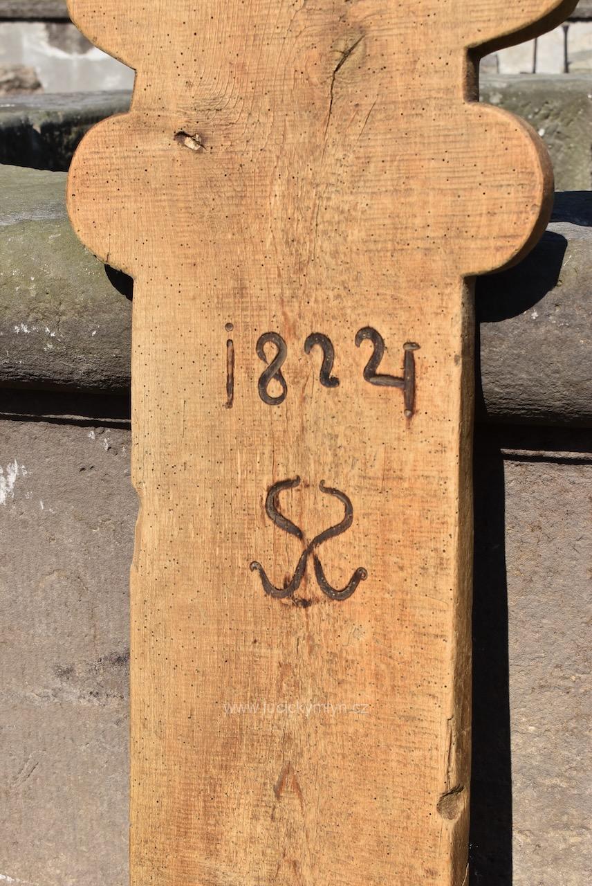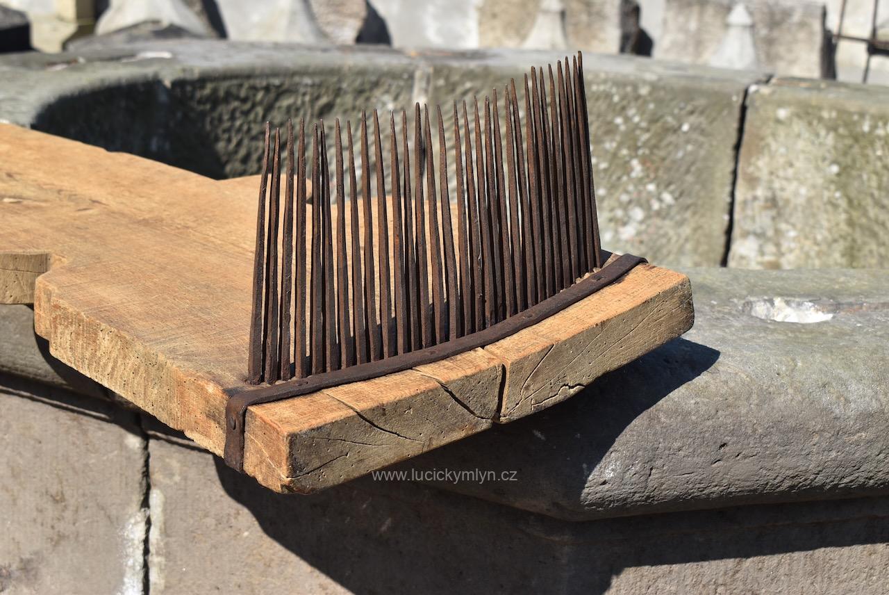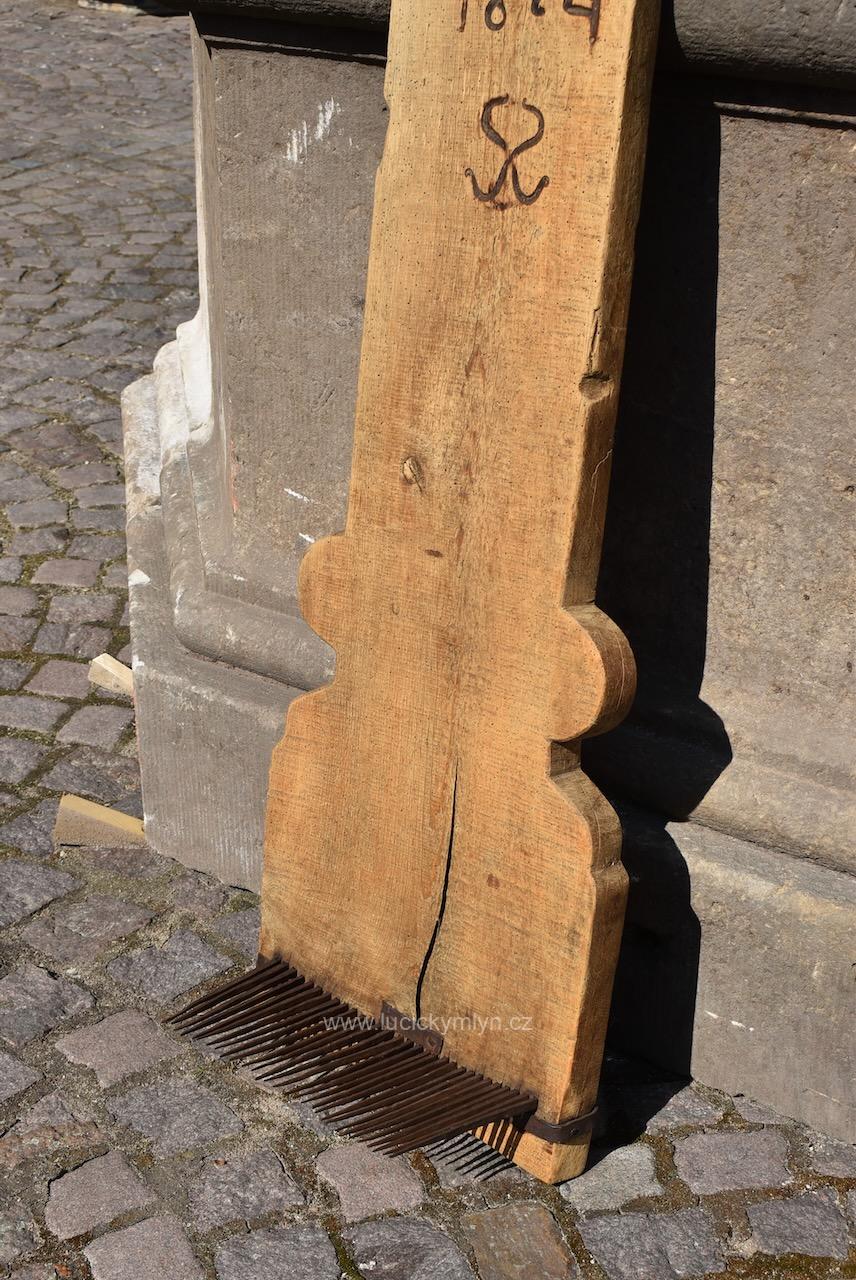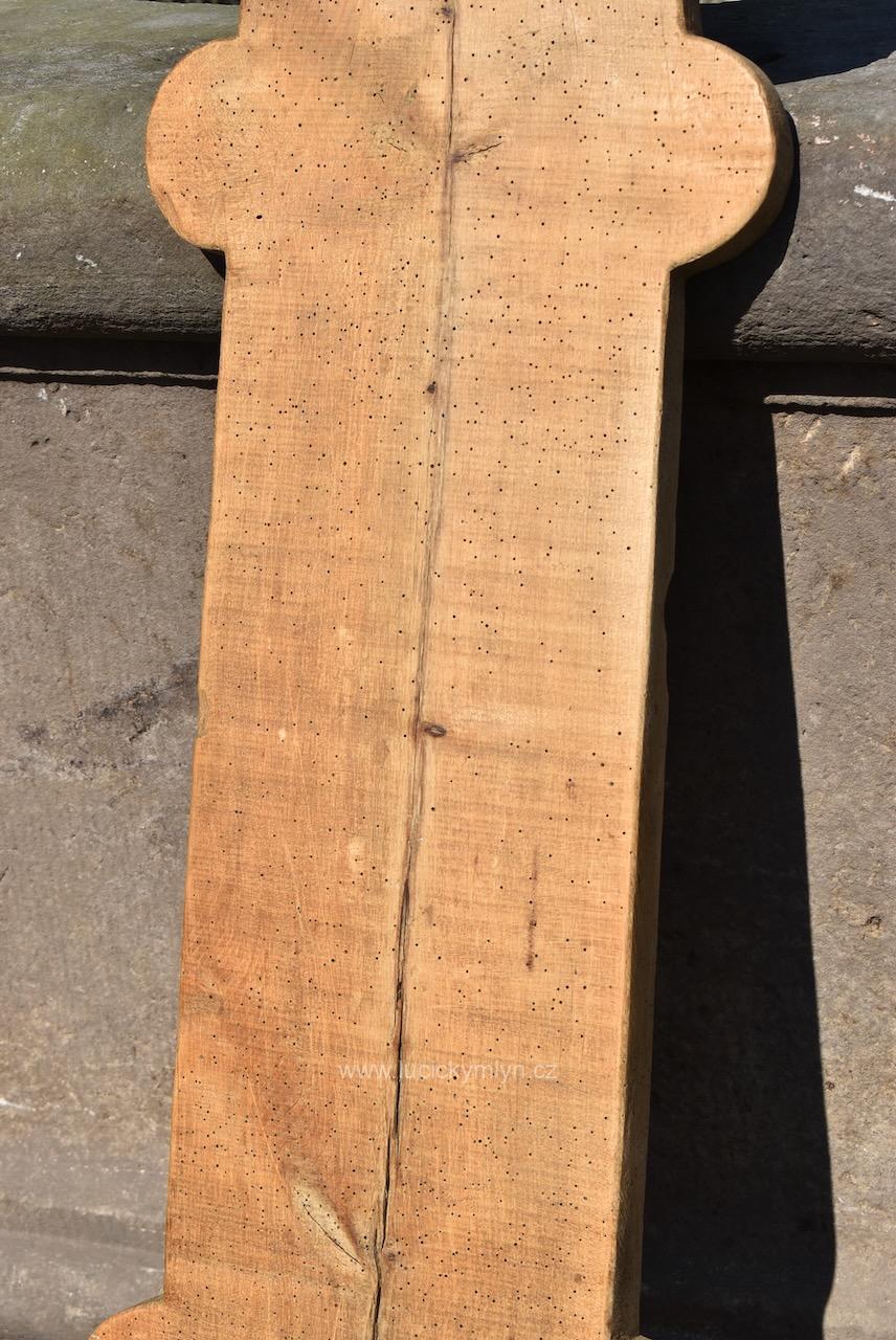 Unikátní starožitný dvouhlavý drhlen s vypálenou datací 1824, ojediněle vyrobený z masivní barokně vykrojené fošny, která je hustě osazena dlouhými a hraněnými, ručně kovanými hřeby