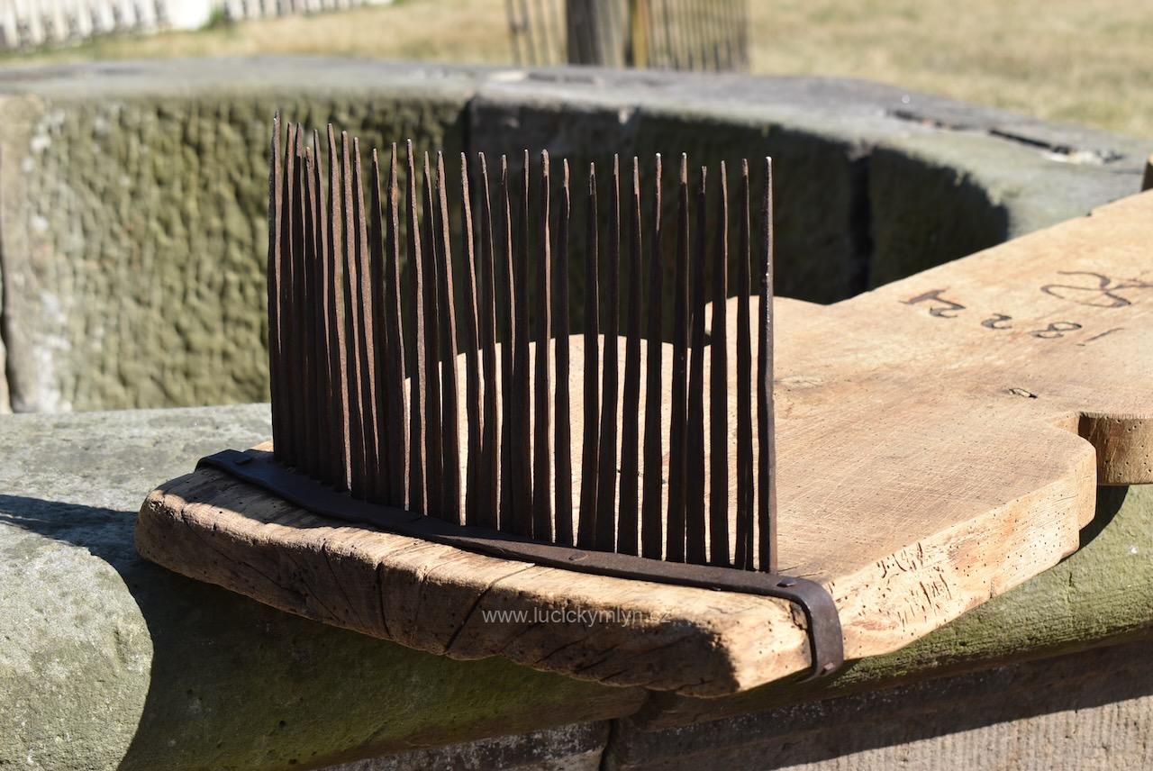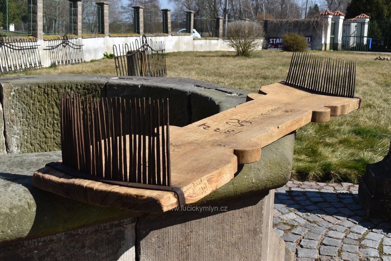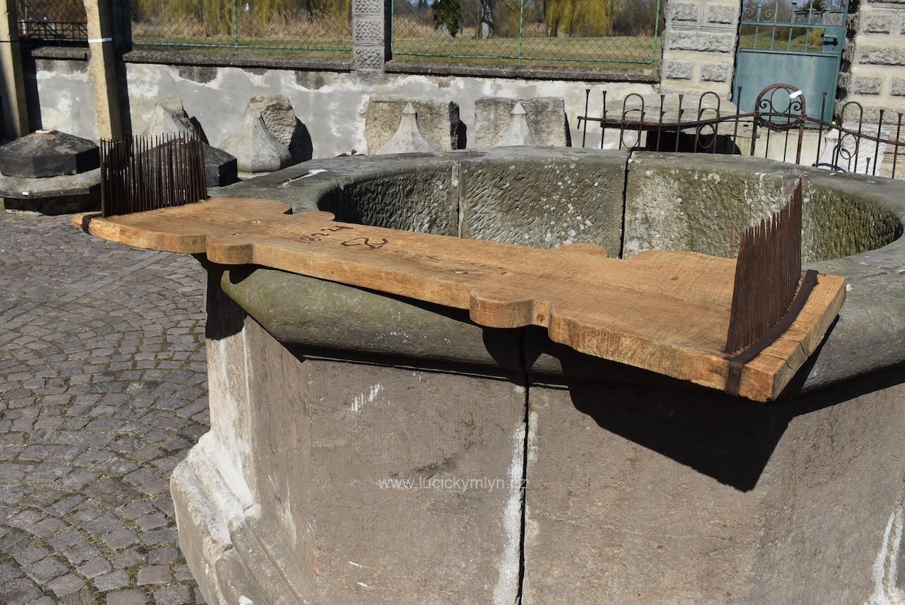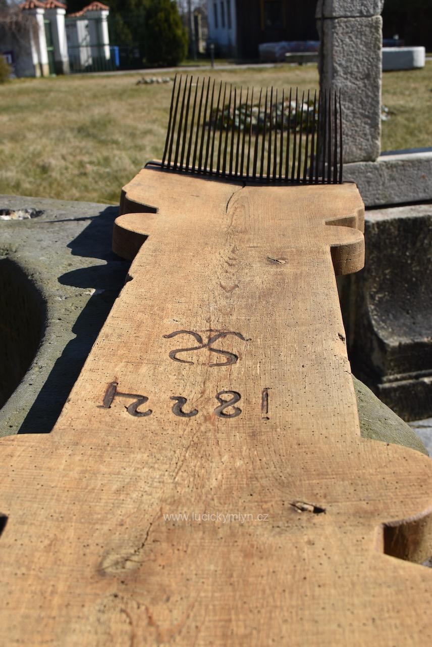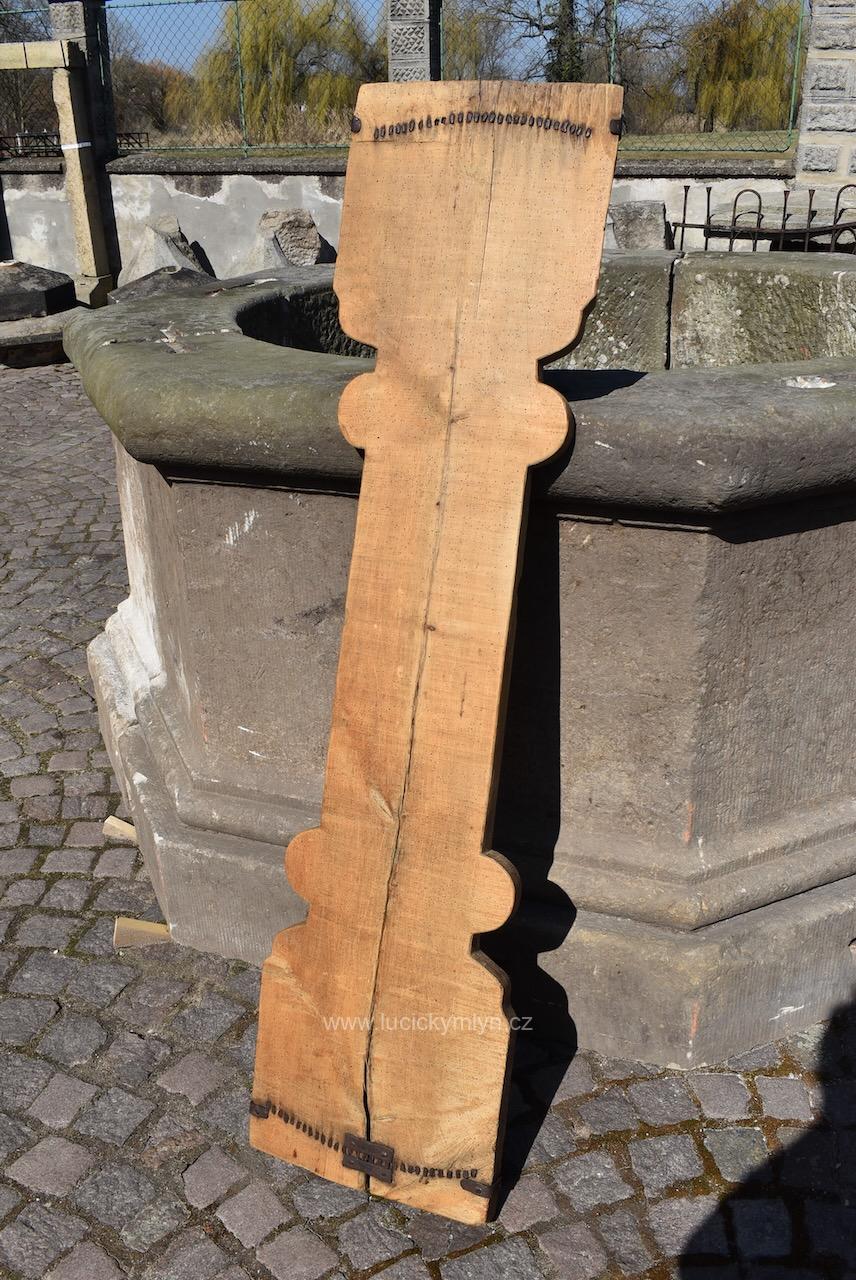 Unikátní starožitný dvouhlavý drhlen s vypálenou datací 1824, ojediněle vyrobený z masivní barokně vykrojené fošny, která je hustě osazena dlouhými a hraněnými, ručně kovanými hřeby