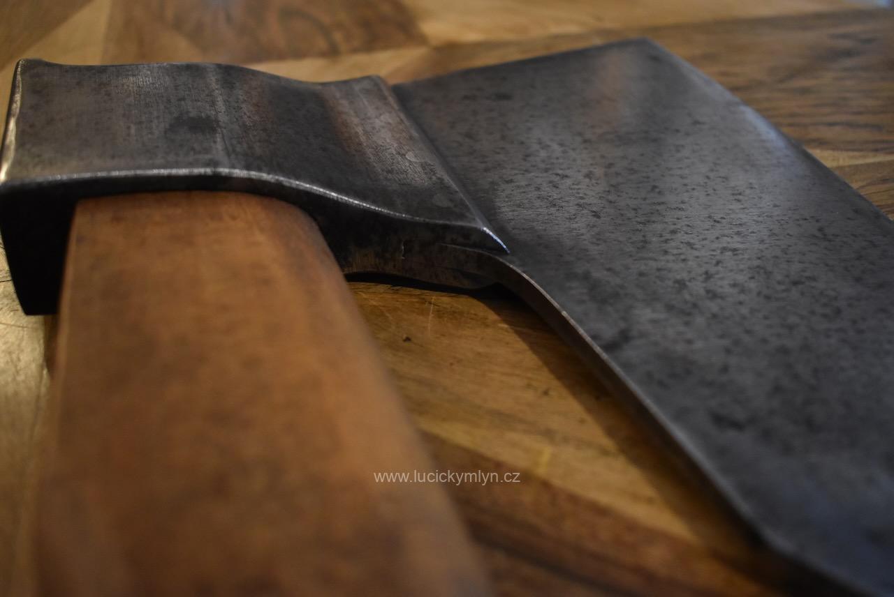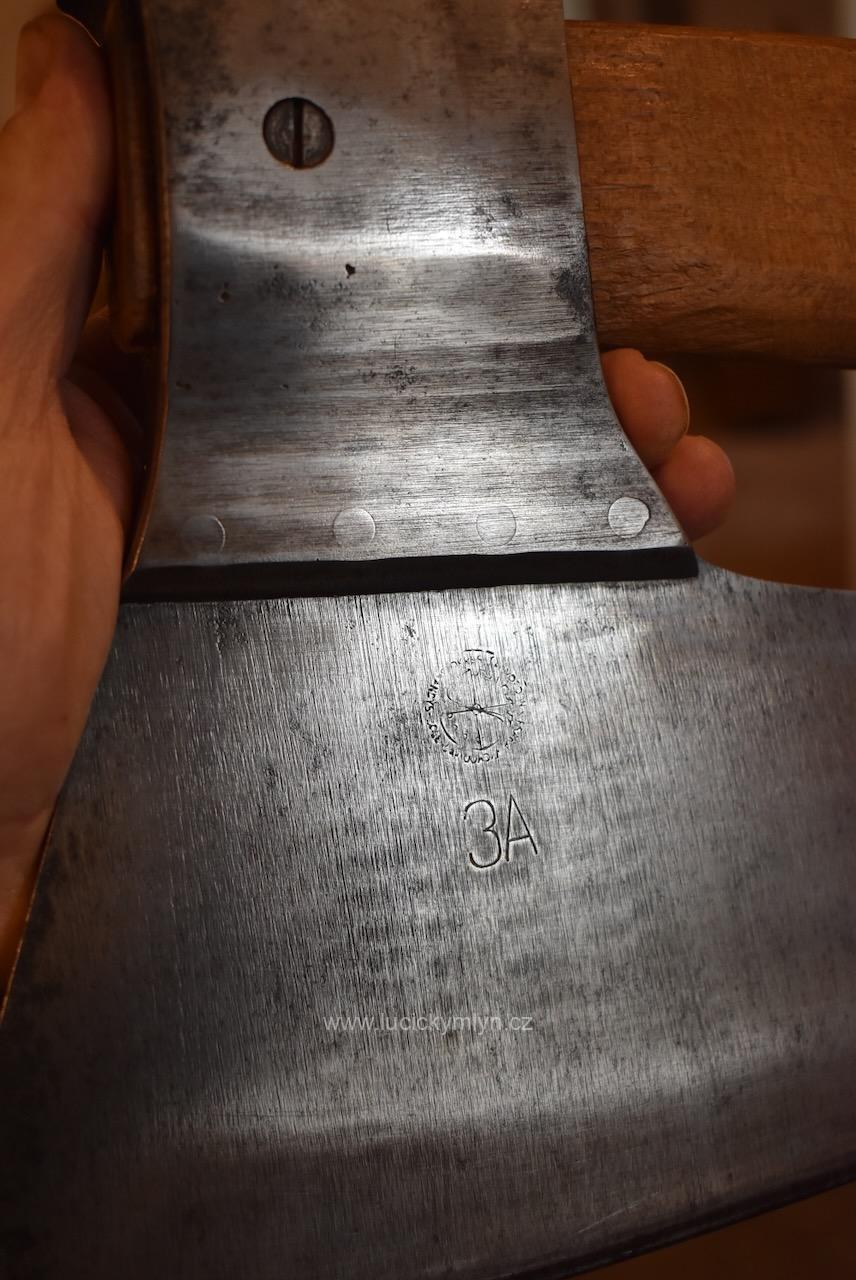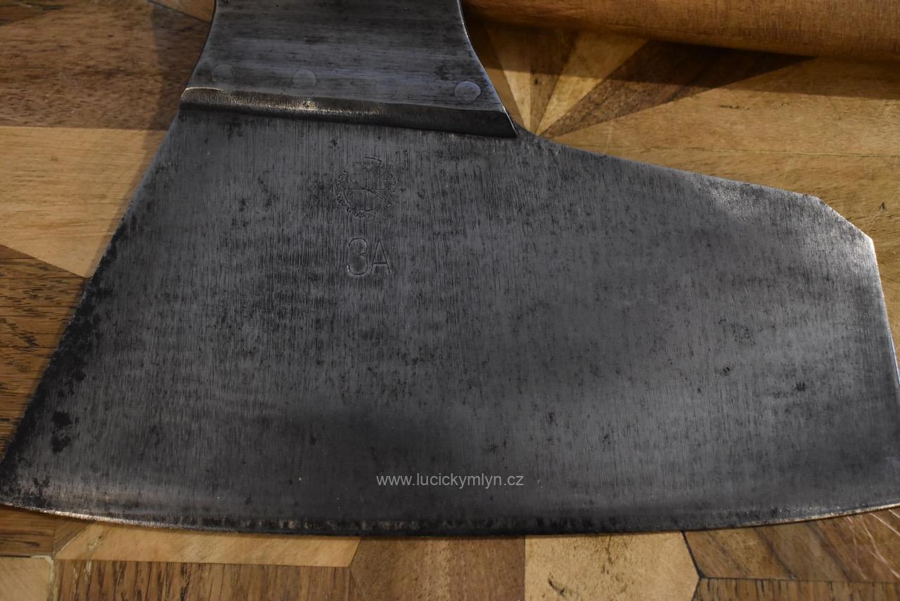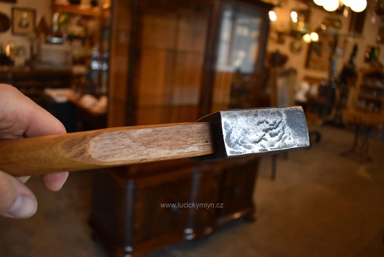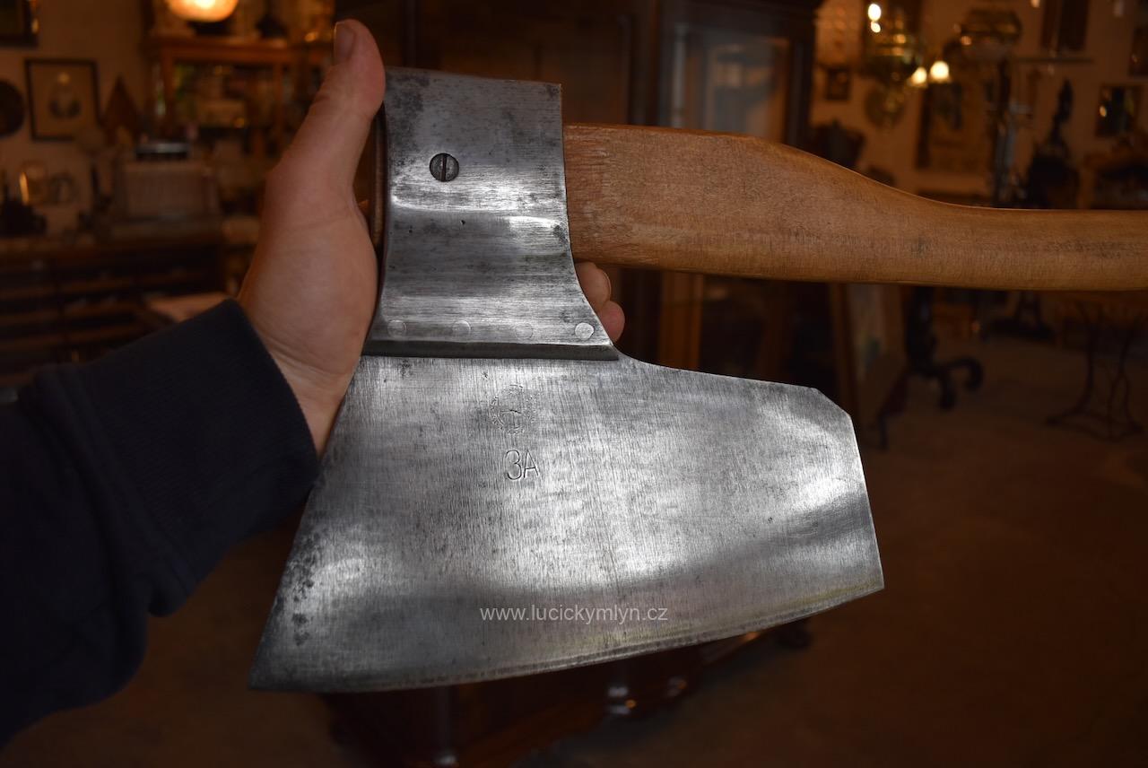 Velká starožitná řeznická bourací sekera – originální prvorepublikový nástroj z 1. 1/3 20. století, s jemně raženou ale hůře čitelnou značkou kovářského výrobce – kruh obklopený čísly a písmeny