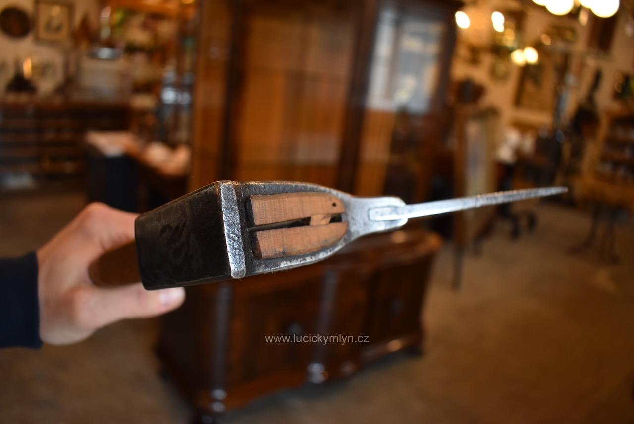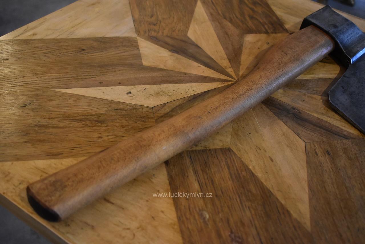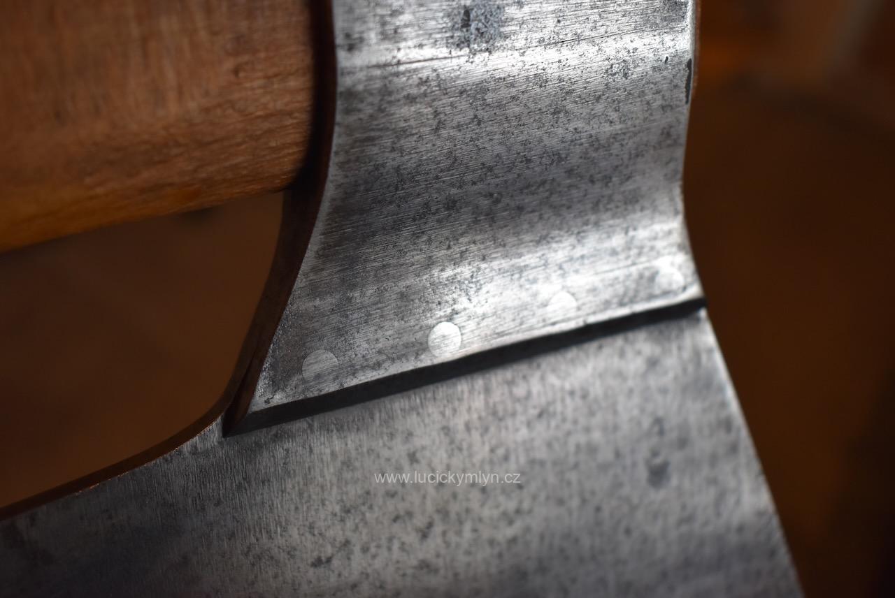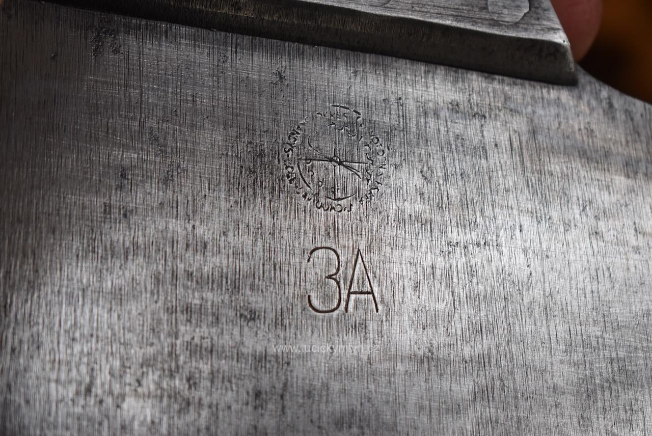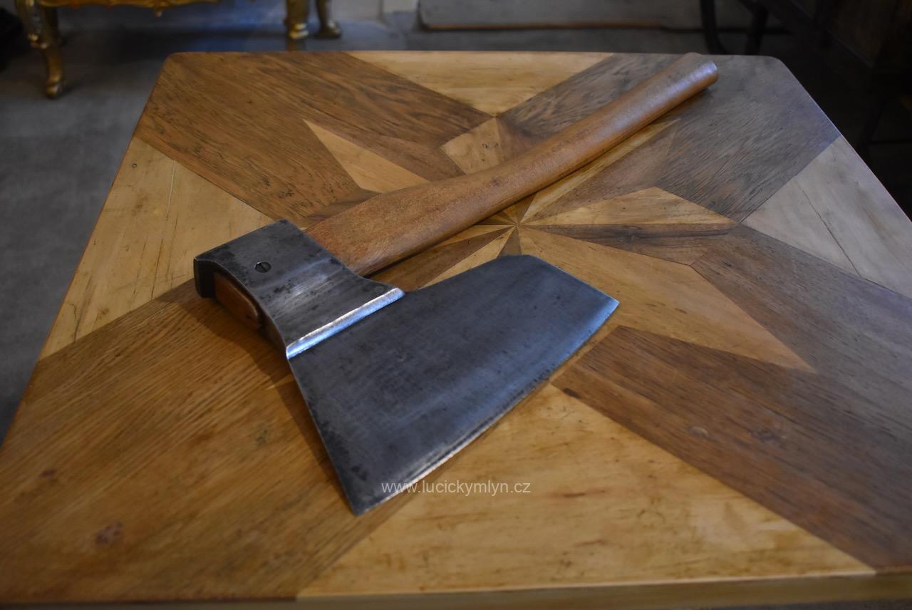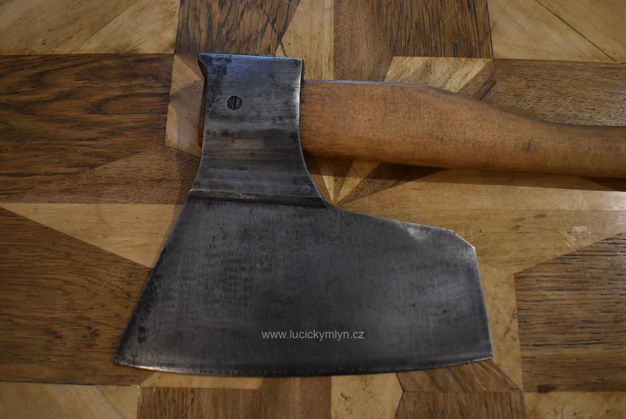 Velká starožitná řeznická bourací sekera – originální prvorepublikový nástroj z 1. 1/3 20. století, s jemně raženou ale hůře čitelnou značkou kovářského výrobce – kruh obklopený čísly a písmeny