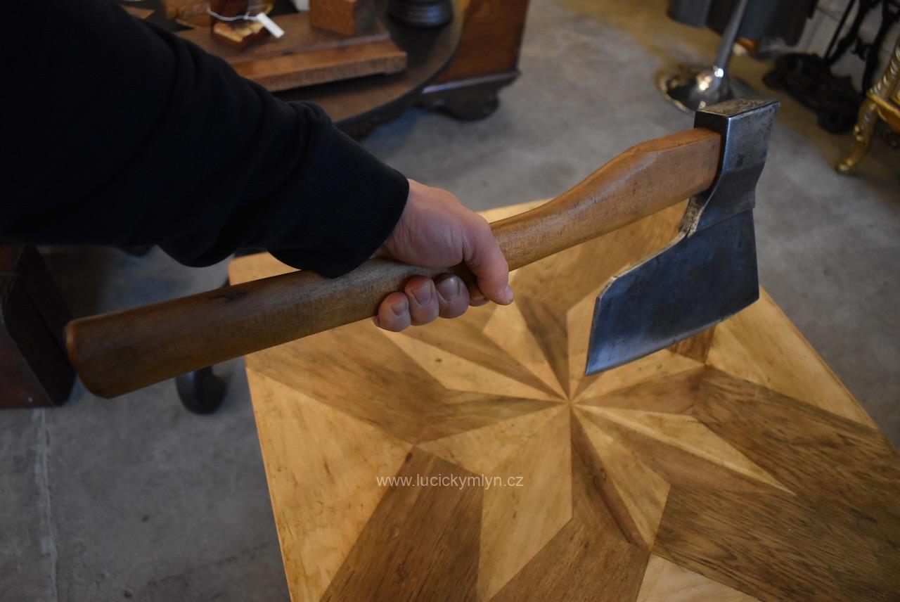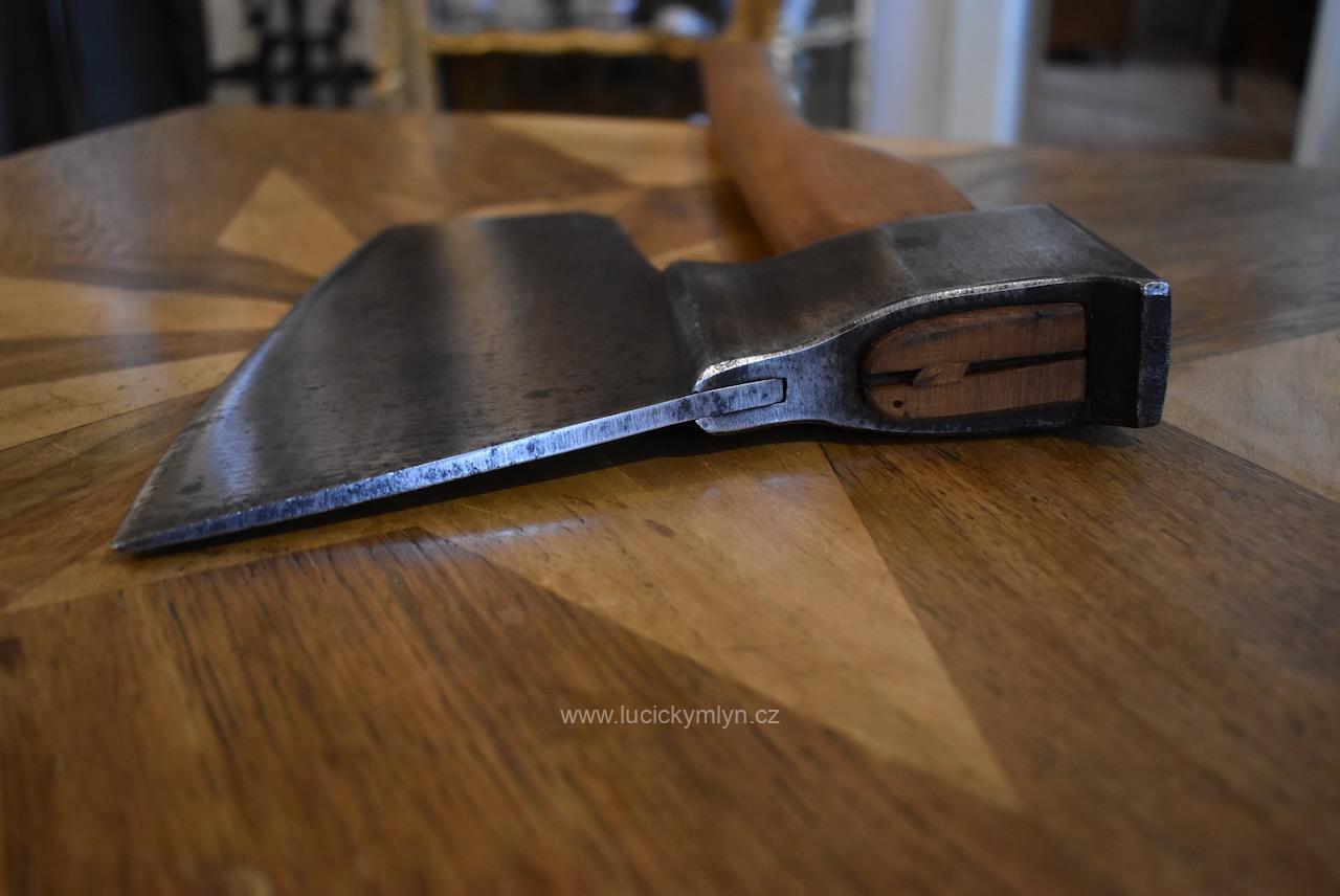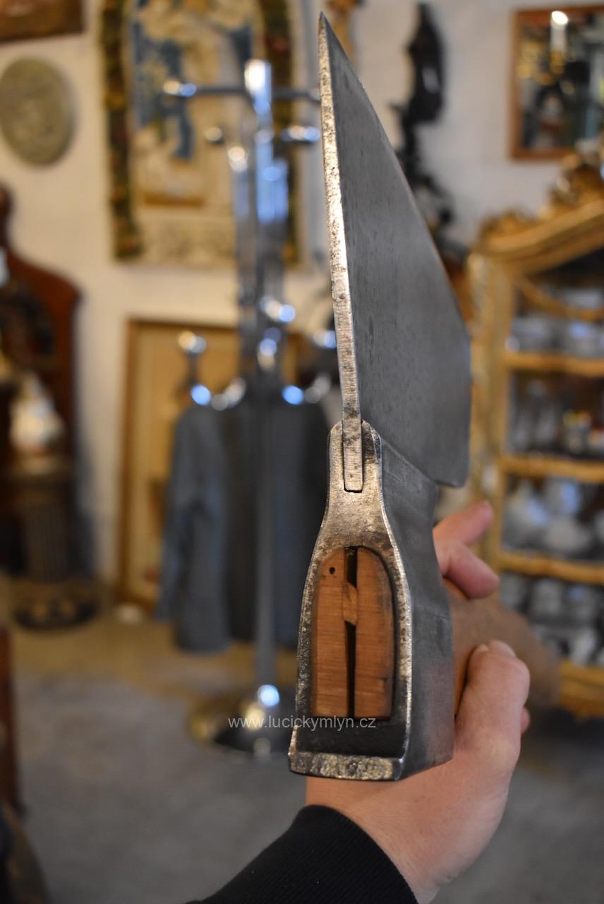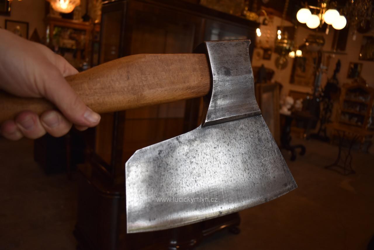 Na vrchní části hlavice má sekera vystouplou kovadlinku, která slouží k rozložení účinku pomocných úderů kladivem při rozseku tuhých partií masa či kostí. Ocelová čepel má vysoké a zejména velmi široké kalené ostří, takže nástroj dobře vede rovný řez a snáší i dlouhodobé zatížení. Jde o původní profesionální nástroj s dobře zachovalým bukovým topůrkem. Řeznická sekera má velkou výpovědní hodnotou, a je vhodná pro řeznické mistry i sběratele, kteří mají vztah k jednomu z nejstarších a nejpotřebnějších řemesel s tisíciletou tradicí. Tato odkazuje i na slavnou historii cechu s českým lvem v erbu, připomínanou od počátku 14. století. Tato velká řeznická sekera byla zbavena mírné koroze, citlivě přeleštěna a konzervována, takže je dnes vhodná jak k vystavení v interiéru, tak jako funkční nástroj při tradičních zabijačkách.