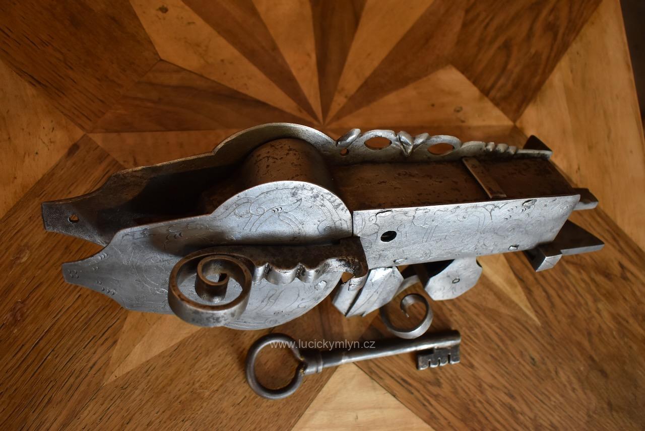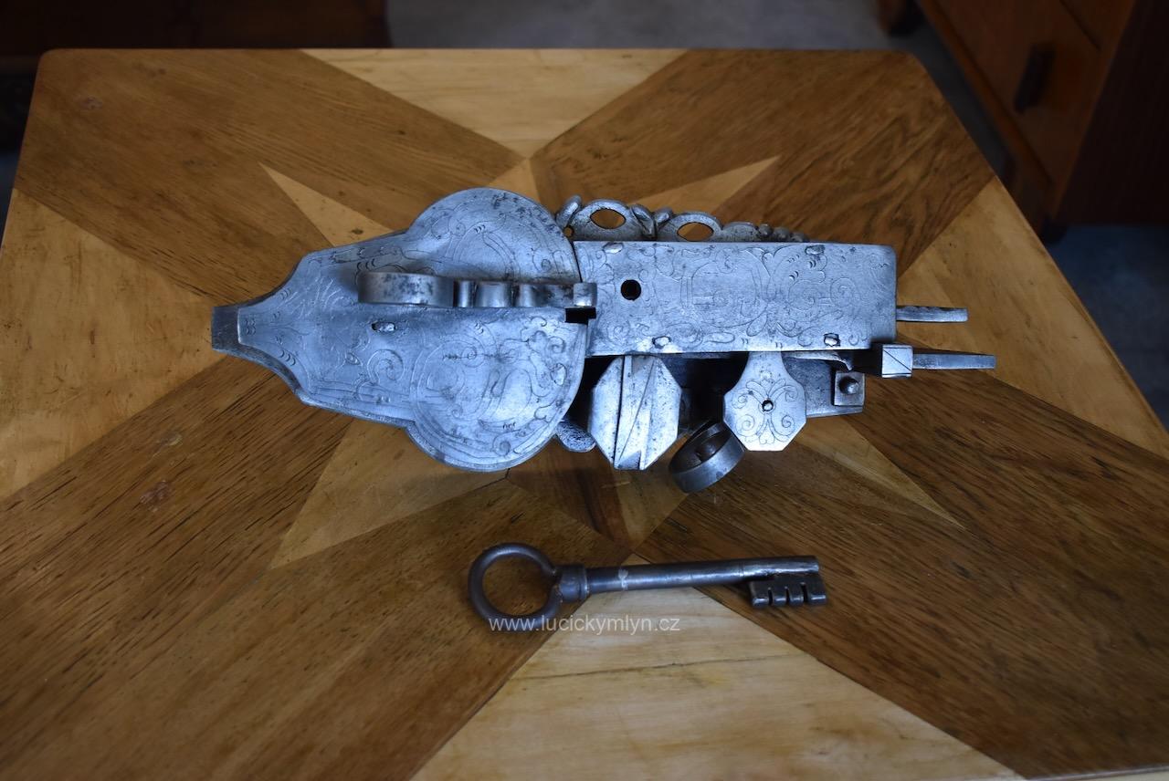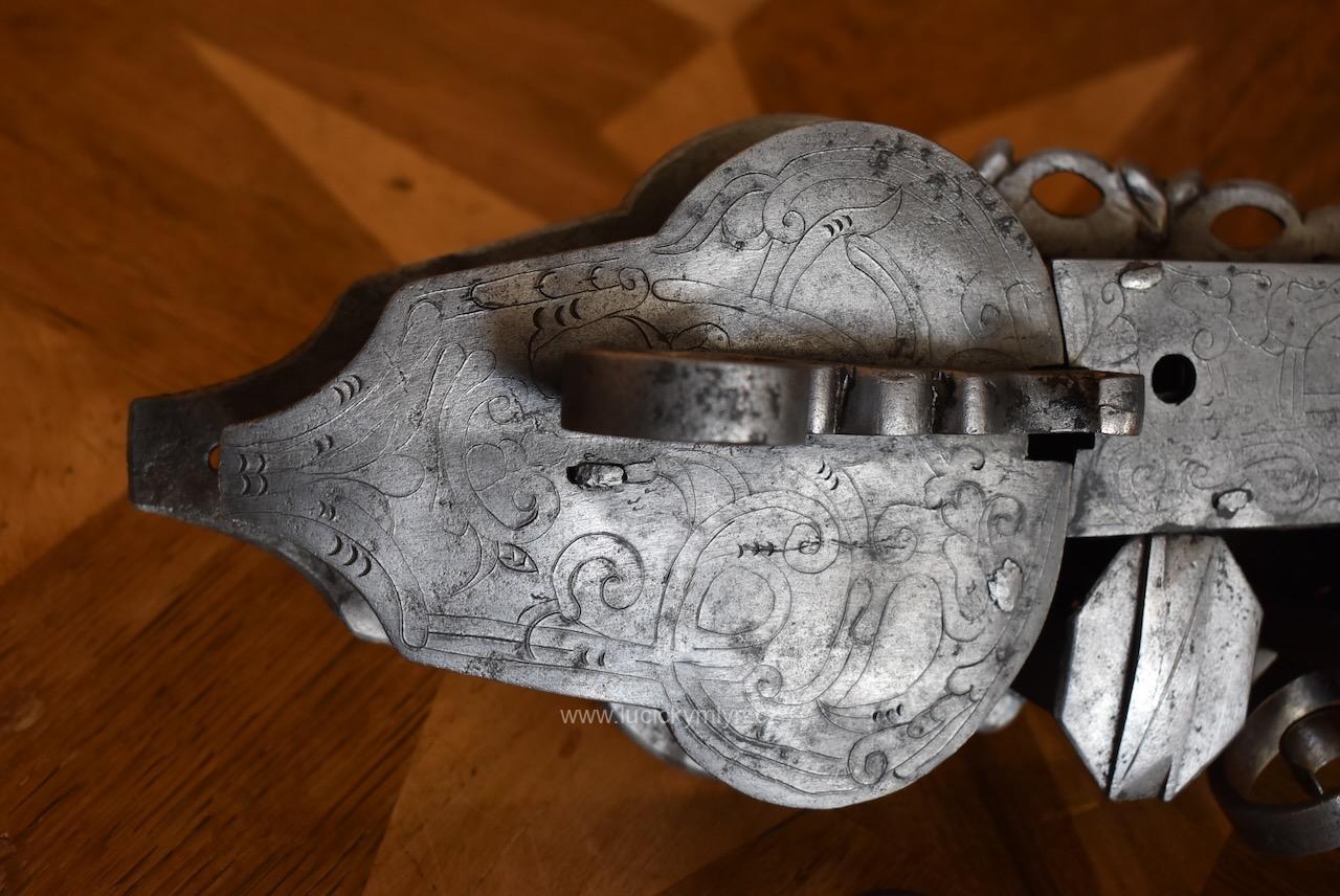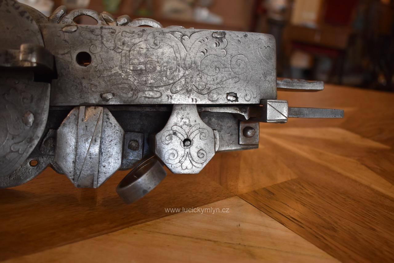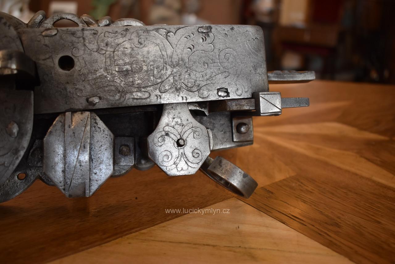 Kvalitní a krásné technicky i umělecky, náročně zpracované dílko dávno zapomenutého mistra kováře, určené pro šlechtu, velmi bohaté měšťanstvo nebo církev. Uzavírací funkci plní dvě silnější vinutá péra z kované oceli. Vrchní přitlačuje robustní pohyblivou závoru směrem dolů. Ta je zakončena ozdobně kovaným tažným držadlem s náznakem voluty. Zámek má ještě druhou posuvnou závoru, která se dá ovládat z vnitřní strany, pevně zabudovaným otočným mechanismem s ozdobně kovanou zavinutou hlavicí. Z druhé (vnější) strany se mechanismus odemyká klasickým dutým klíčem, který byl nově vyroben a pečlivě napasován a má osazené oko z originálního klíče, jež odpovídá danému období. Malá vnitřní klika viditelná na druhé straně dveří se již nedochovala. Veliký zámek má florálně prořezávanou a plasticky tepanou základní desku i nákladně řešený domeček s osmibokou „stříškou“ a uvnitř se třemi planžetovými zábranami, kterými prochází úzce prořezávaný praporec otáčejícího se klíče. Vrchní pohledové plochy renesančního zámku velkoryse zdobí jemně ryté florální stylizace. Velký a reprezentativní zámek, vhodný k muzejnímu či sběratelskému využití, nebo k osazení na hodnotné dveře v renesančním či raně barokním interiéru. Velmi dobrý původní stav po citlivém vyčištění, přeleštění a konzervaci.