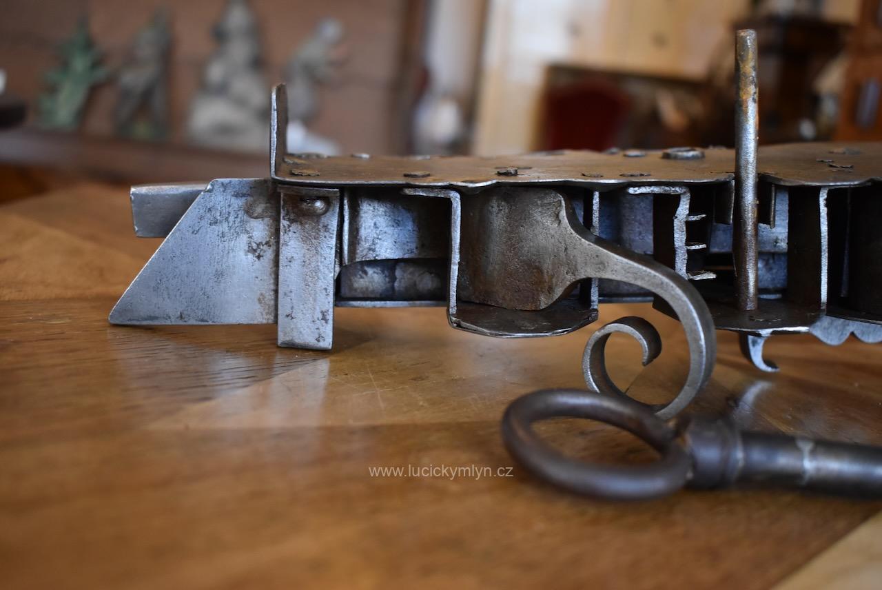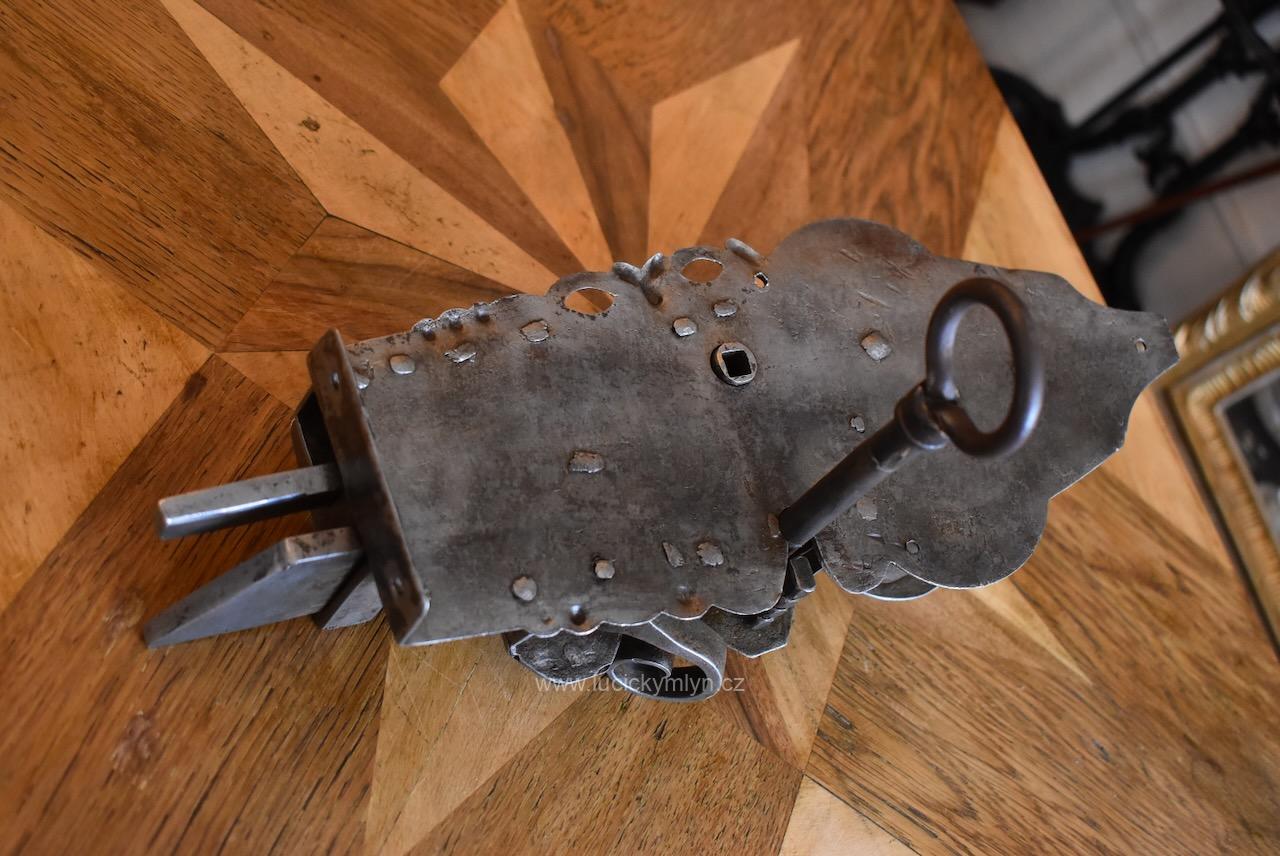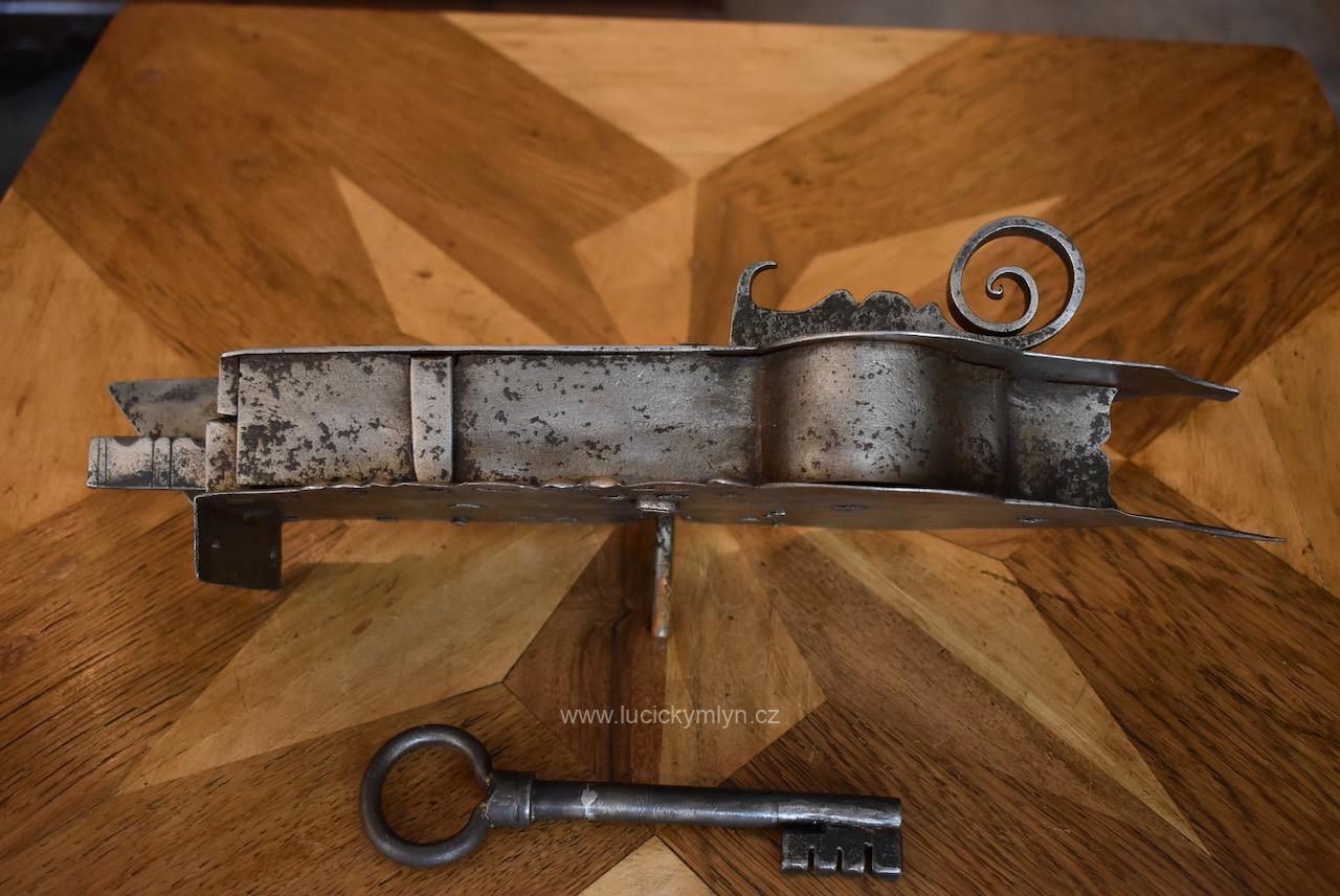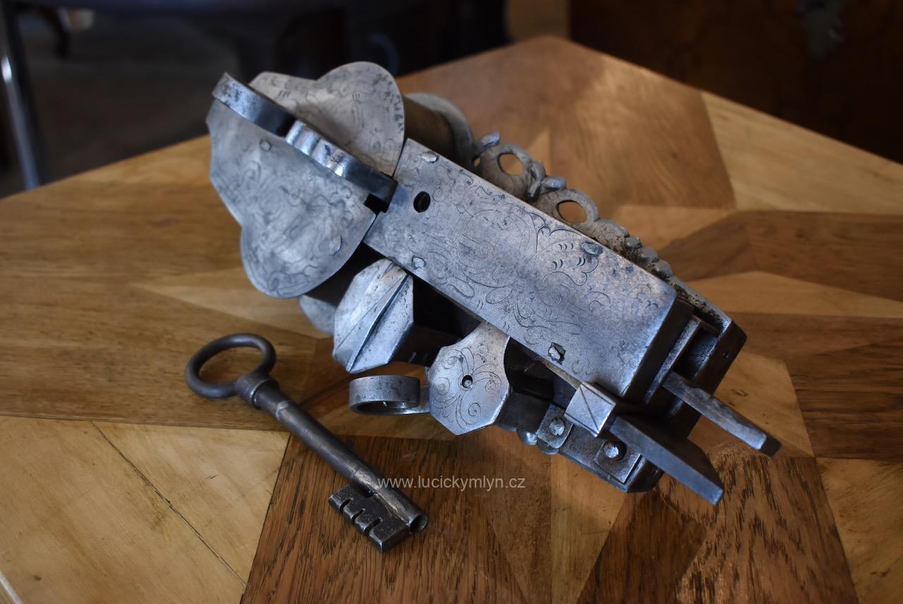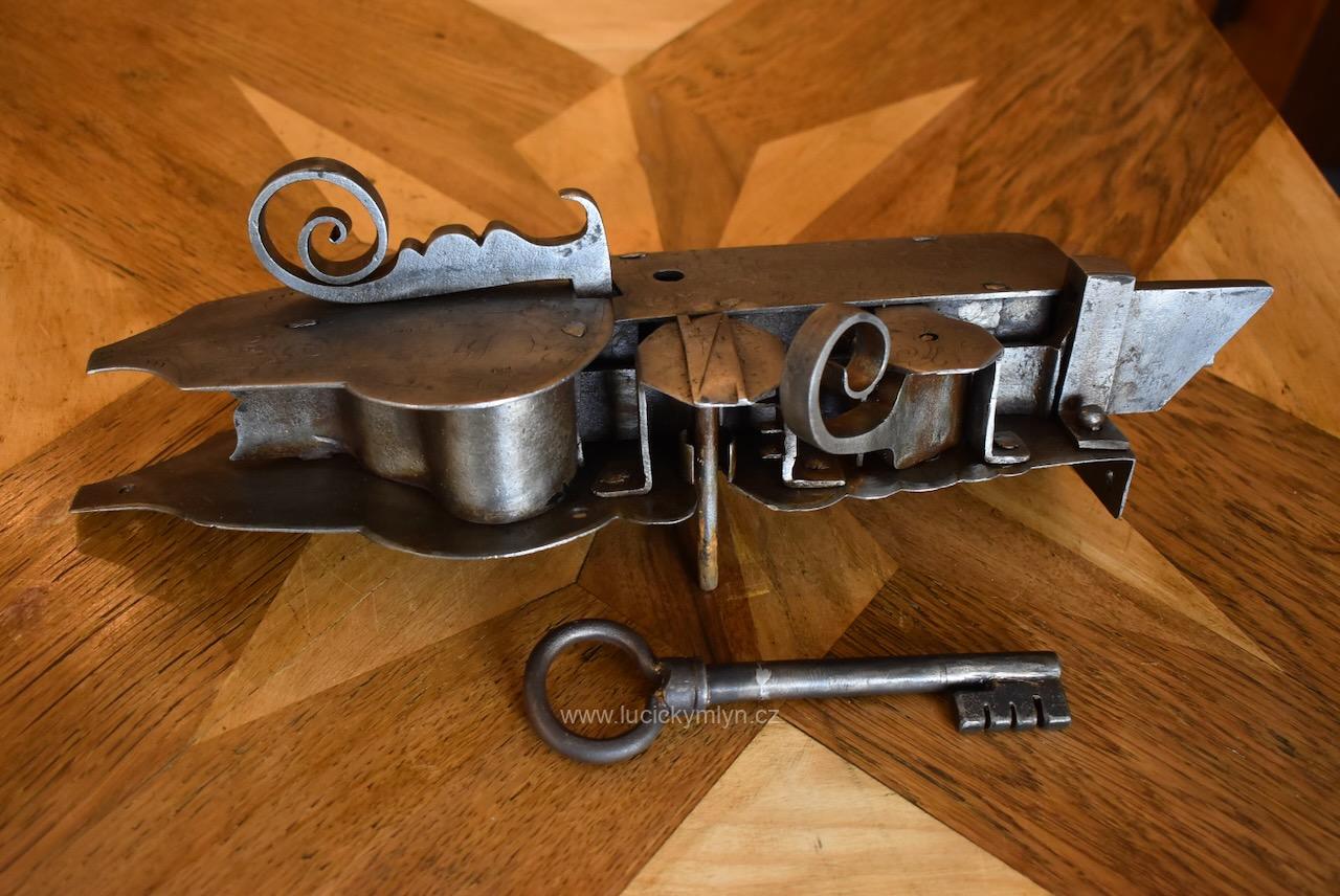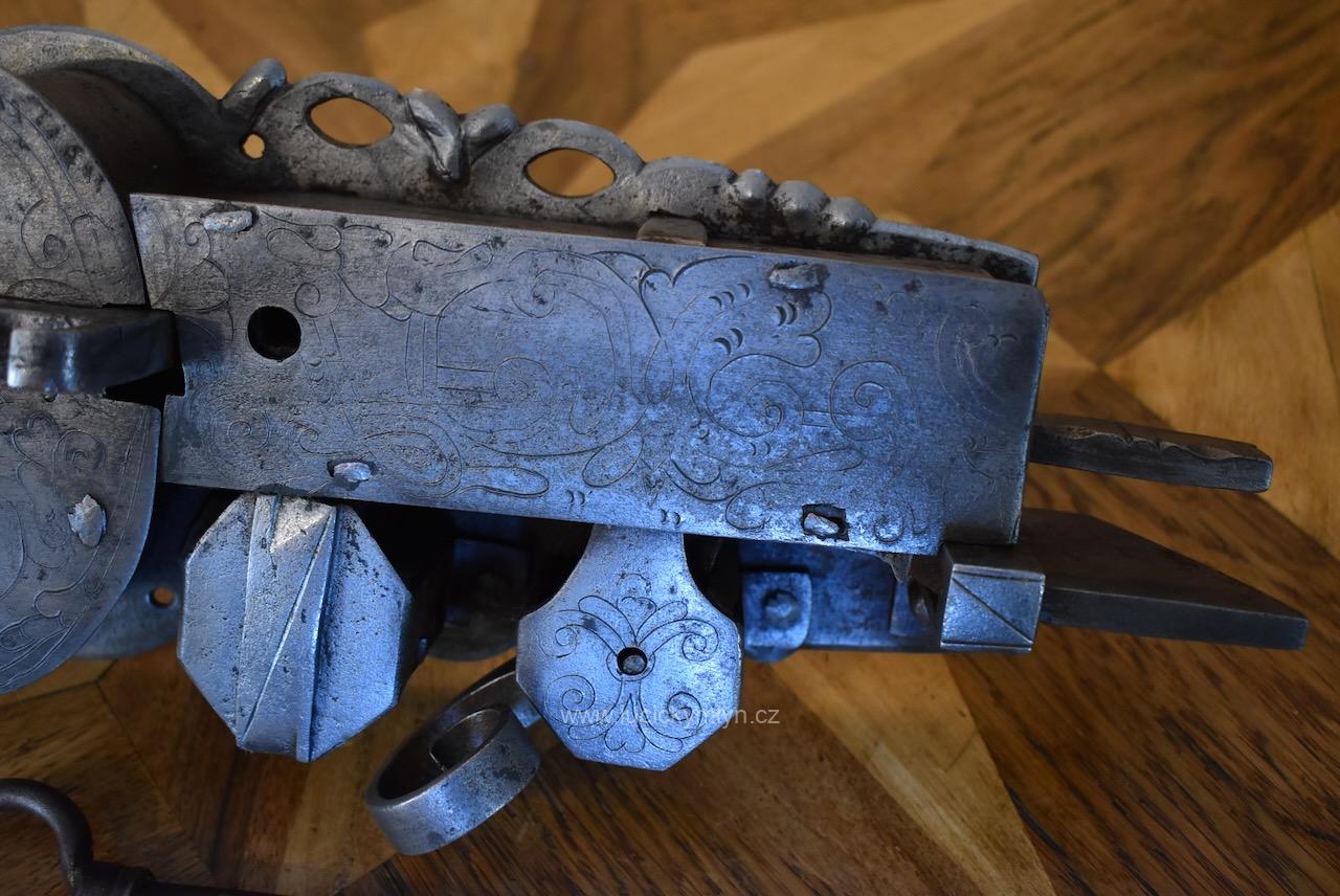Kvalitní a krásné technicky i umělecky, náročně zpracované dílko dávno zapomenutého mistra kováře, určené pro šlechtu, velmi bohaté měšťanstvo nebo církev. Uzavírací funkci plní dvě silnější vinutá péra z kované oceli. Vrchní přitlačuje robustní pohyblivou závoru směrem dolů. Ta je zakončena ozdobně kovaným tažným držadlem s náznakem voluty. Zámek má ještě druhou posuvnou závoru, která se dá ovládat z vnitřní strany, pevně zabudovaným otočným mechanismem s ozdobně kovanou zavinutou hlavicí. Z druhé (vnější) strany se mechanismus odemyká klasickým dutým klíčem, který byl nově vyroben a pečlivě napasován a má osazené oko z originálního klíče, jež odpovídá danému období. Malá vnitřní klika viditelná na druhé straně dveří se již nedochovala. Veliký zámek má florálně prořezávanou a plasticky tepanou základní desku i nákladně řešený domeček s osmibokou „stříškou“ a uvnitř se třemi planžetovými zábranami, kterými prochází úzce prořezávaný praporec otáčejícího se klíče. Vrchní pohledové plochy renesančního zámku velkoryse zdobí jemně ryté florální stylizace. Velký a reprezentativní zámek, vhodný k muzejnímu či sběratelskému využití, nebo k osazení na hodnotné dveře v renesančním či raně barokním interiéru. Velmi dobrý původní stav po citlivém vyčištění, přeleštění a konzervaci.