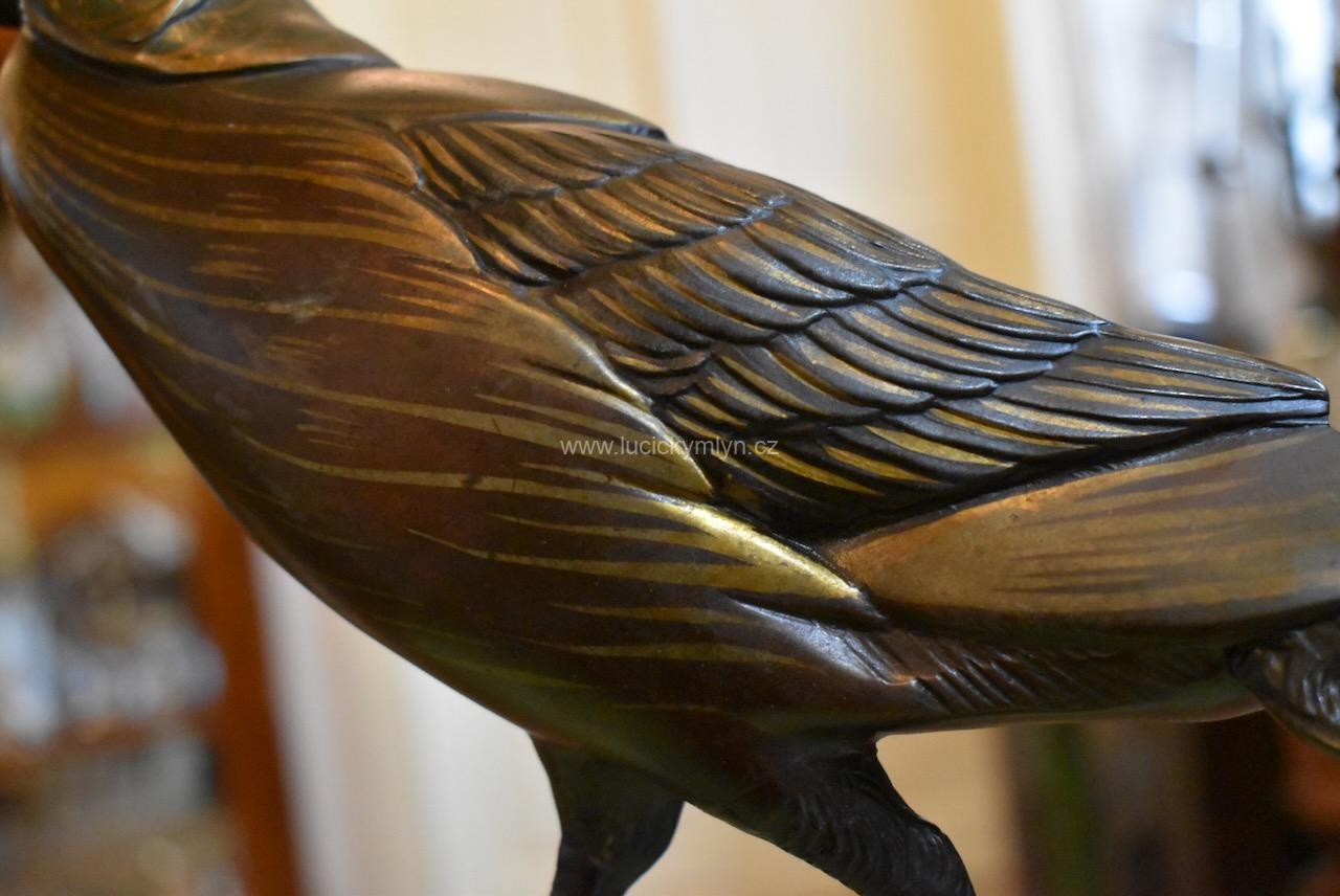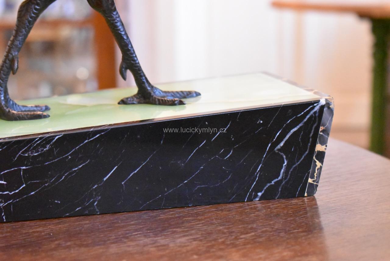 Kvalitní kovolitecké dílko s loveckým námětem bylo usazeno na široký zešikmený podstavec jehož hlavní deska je zhotovena z leštěného, světle zeleného, polodrahokamu zvaného onyx. Obvodové stěny šikmé podstavy, tvoří dílce z černého ušlechtilého mramoru. Hezká tematická dekorace i sběratelské kovolitecké dílko, věrně zpodobňující bažanta, pochází z 1. třetiny 20. stol. Velmi dobrý původní stav po lehkém očištění a přeleštění kovu i ušlechtilého kamene.