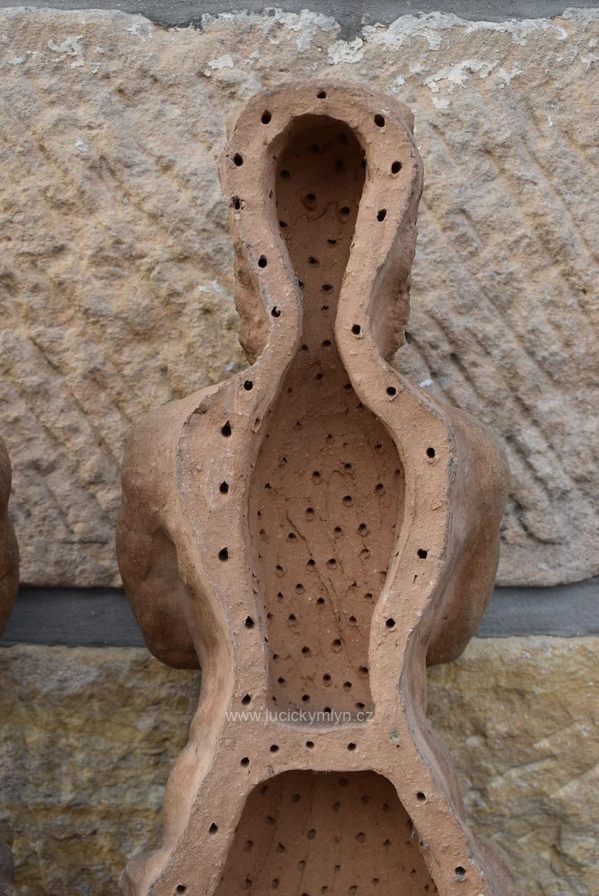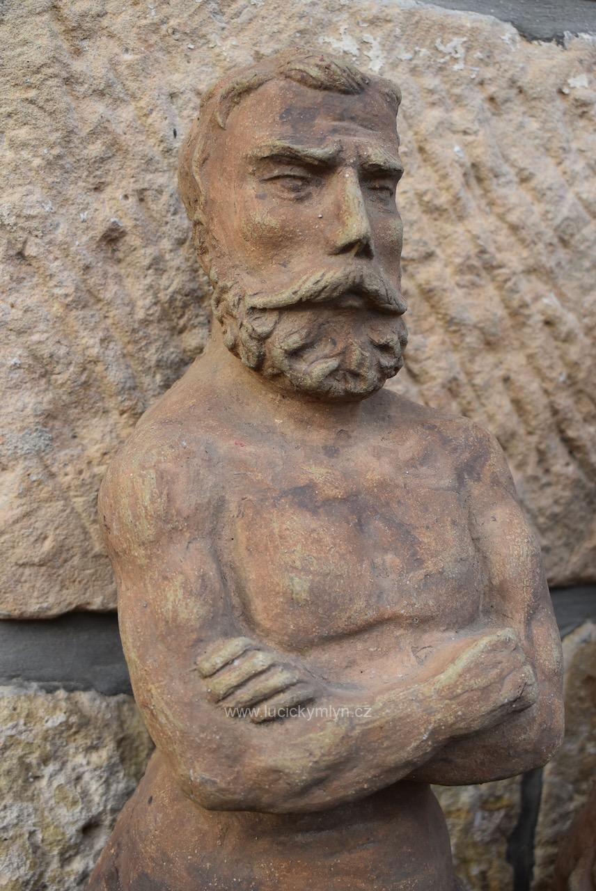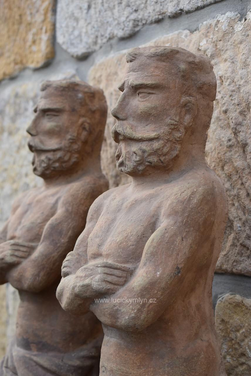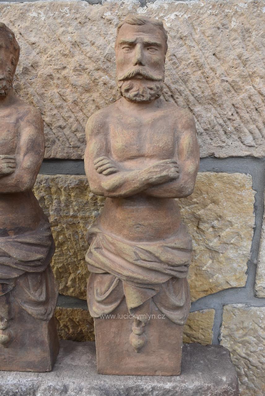 Větší starožitné, fasádní pilastrové ozdoby – sošky Atlantů, vyrobené okolo roku 1900 z ostře pálené hlíny