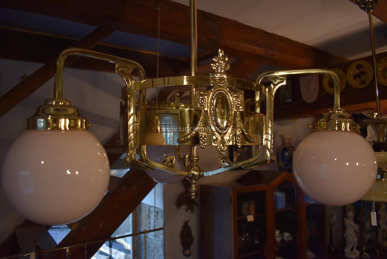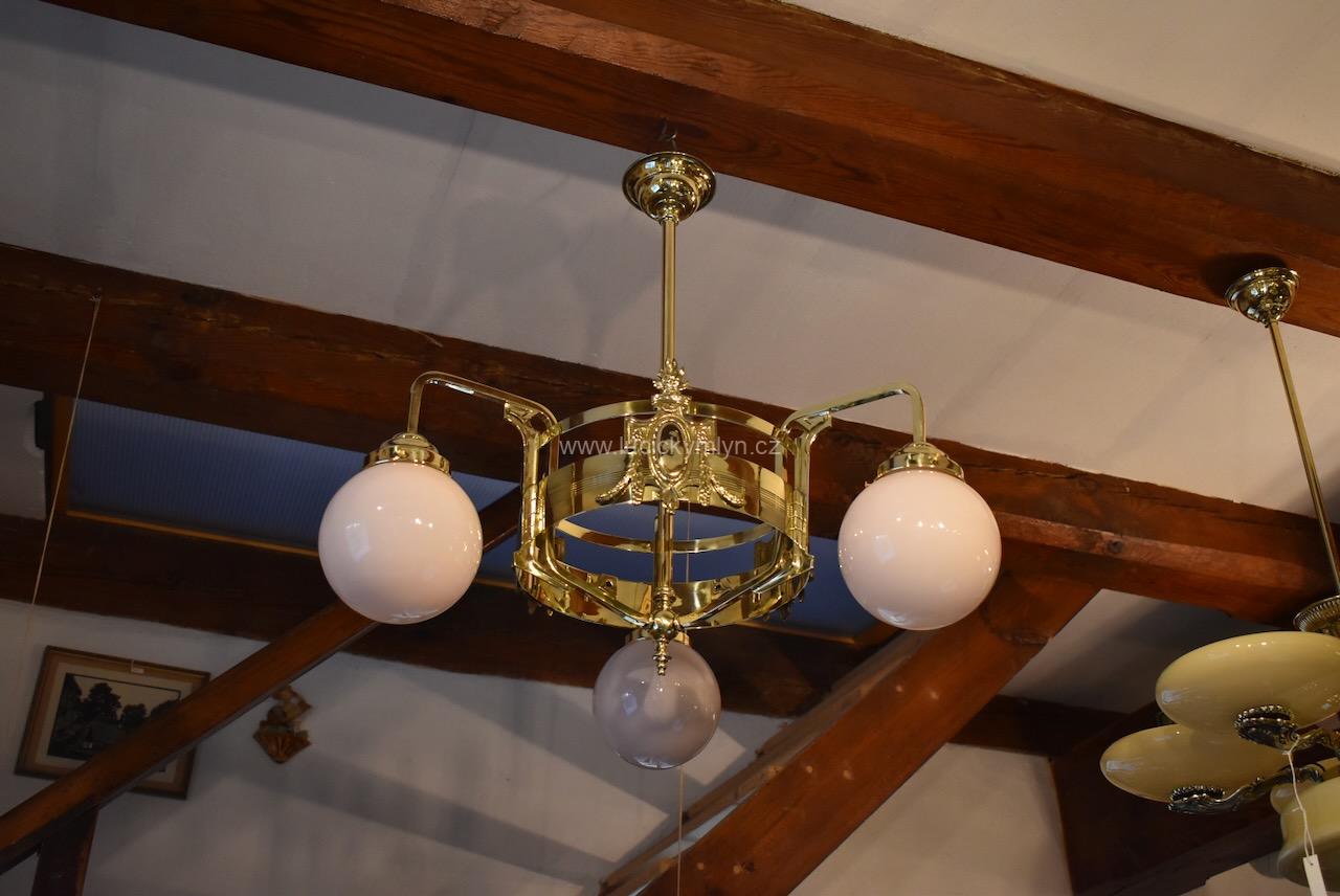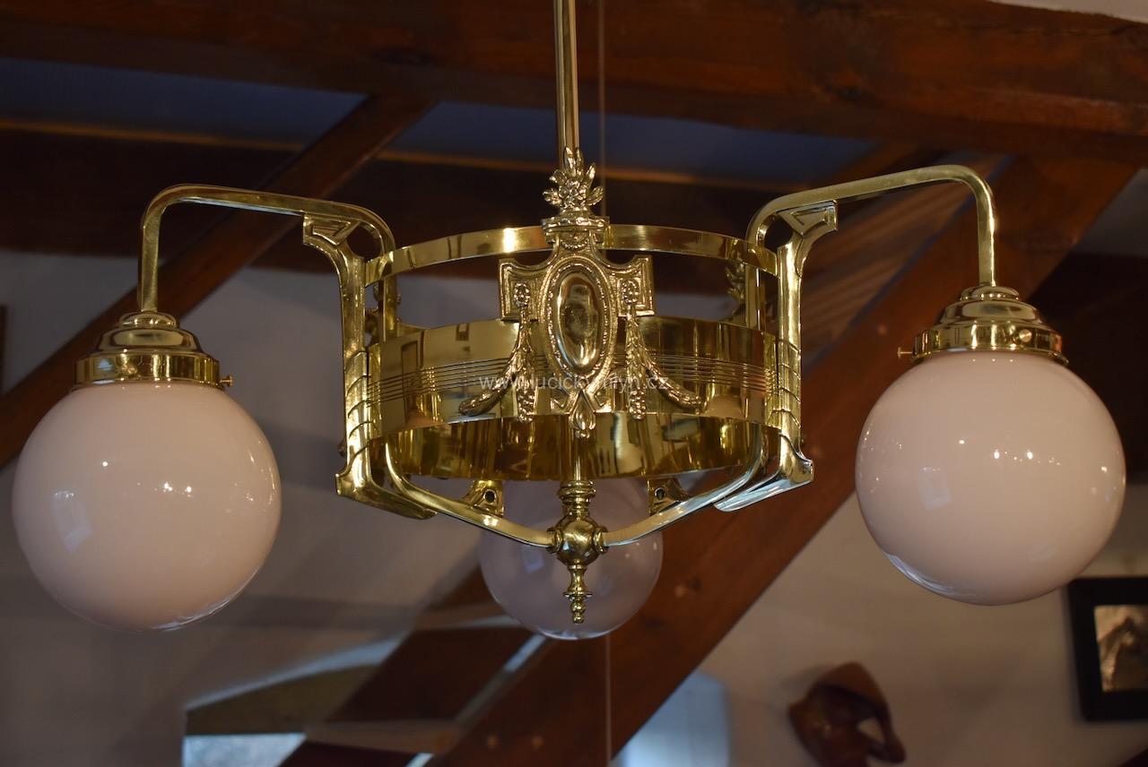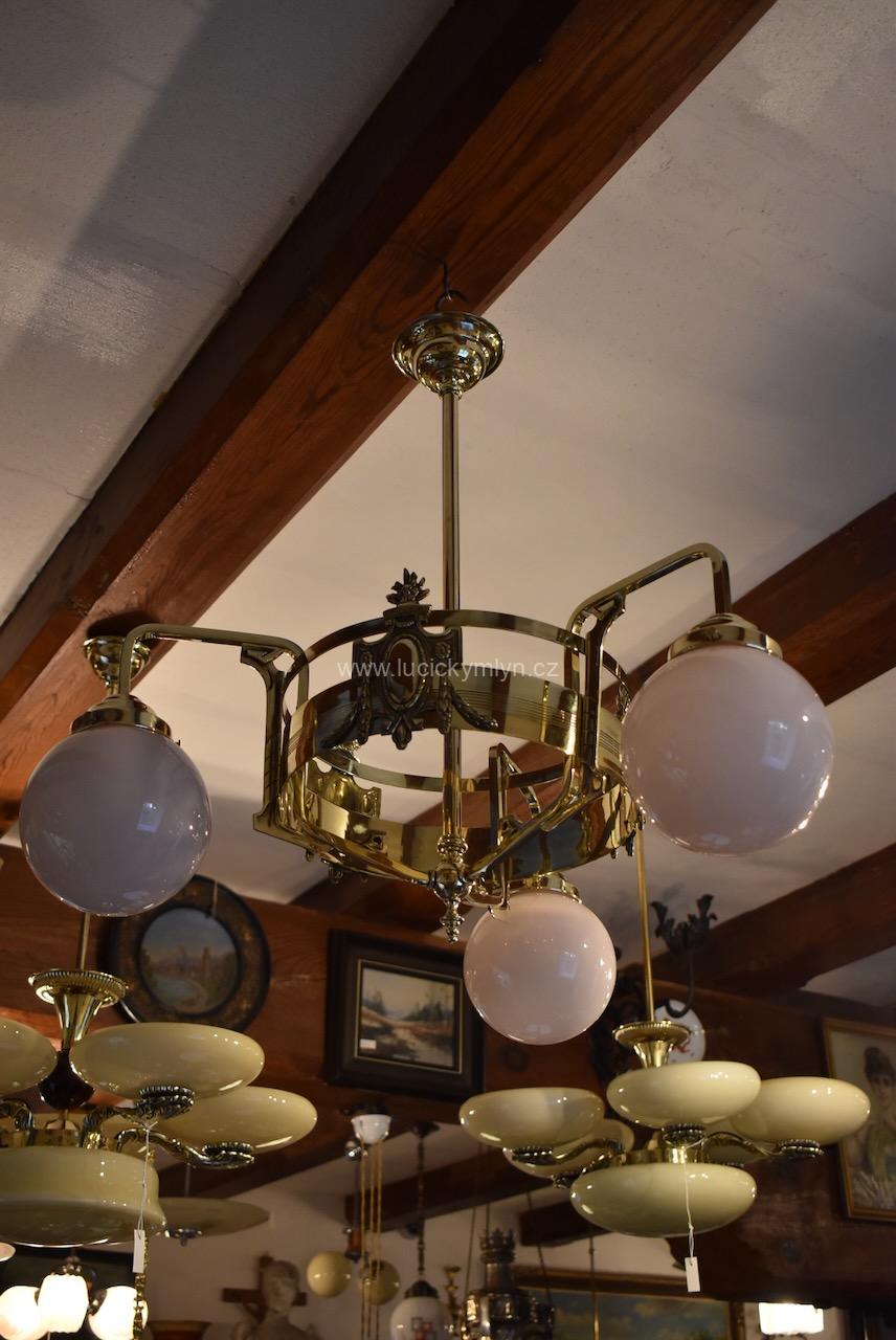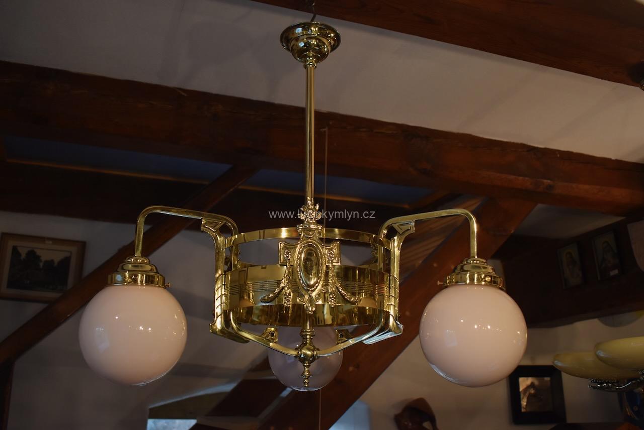 Vkusné a velice kvalitní světlo, bylo vyrobeno převážně z masivní lité a zlatě leštěné mosazi, po roce 1900. Tento zajímavý lustr, nápaditě osazený vzdušným a elegantně ztvárněným, nižším obručovým pláštěm, je působivě osazený třemi nezvykle ztvárněnými rameny, na kterých vidíme krásné, secesně stylizované, aplikace. Na širokém prstenci lustru můžeme obdivovat krásně ztvárněné secesní aplikace. Světlo má na vrcholu centrálního trubičkového závěsu nasazený, stupňovitě tlačený, mosazný krycí štítek pro el. připojení. Atypicky navržený tří-ramenný lustr má svisle zakončená hraněná ramena, osazená mosaznými upevňovacími „kloboučky” s lehce narůžovělými skleněnými koulemi. Díky nadčasové, geometricky stylizované a vkusně umírněné secesní výzdobě, můžeme toto, dnes už poměrně unikátní světlo umístit do rozličných historických prostor, nebo i ryze moderního interiéru. Salonní lustr je po celkové nákladné renovaci a s nově provedenou elektroinstalací. Mosazné objímky s porcelánovým kroužkem, mají klasický závit na běžnou žárovku.