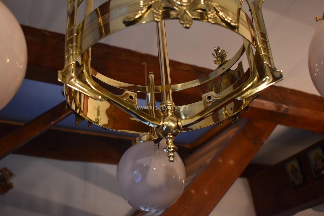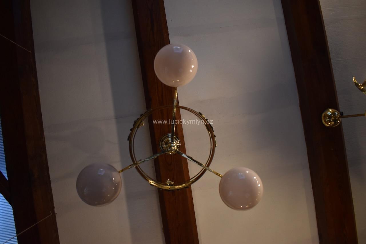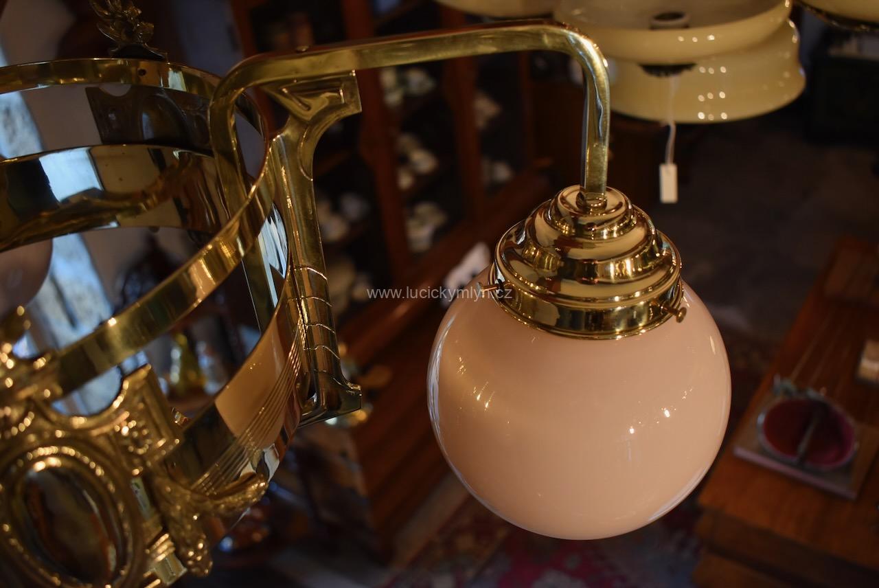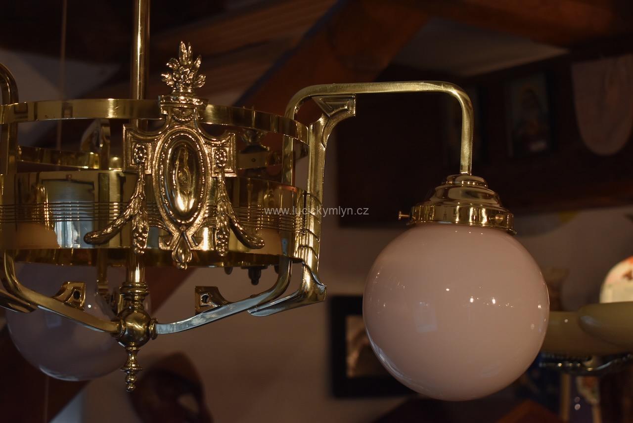 Vkusné a velice kvalitní světlo, bylo vyrobeno převážně z masivní lité a zlatě leštěné mosazi, po roce 1900. Tento zajímavý lustr, nápaditě osazený vzdušným a elegantně ztvárněným, nižším obručovým pláštěm, je působivě osazený třemi nezvykle ztvárněnými rameny, na kterých vidíme krásné, secesně stylizované, aplikace. Na širokém prstenci lustru můžeme obdivovat krásně ztvárněné secesní aplikace. Světlo má na vrcholu centrálního trubičkového závěsu nasazený, stupňovitě tlačený, mosazný krycí štítek pro el. připojení. Atypicky navržený tří-ramenný lustr má svisle zakončená hraněná ramena, osazená mosaznými upevňovacími „kloboučky” s lehce narůžovělými skleněnými koulemi. Díky nadčasové, geometricky stylizované a vkusně umírněné secesní výzdobě, můžeme toto, dnes už poměrně unikátní světlo umístit do rozličných historických prostor, nebo i ryze moderního interiéru. Salonní lustr je po celkové nákladné renovaci a s nově provedenou elektroinstalací. Mosazné objímky s porcelánovým kroužkem, mají klasický závit na běžnou žárovku.