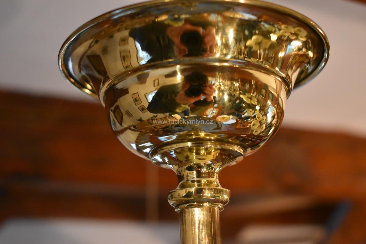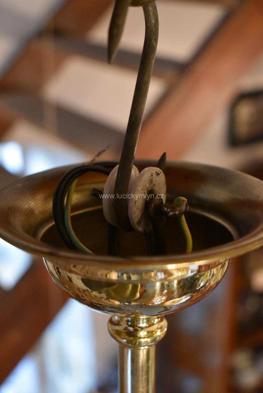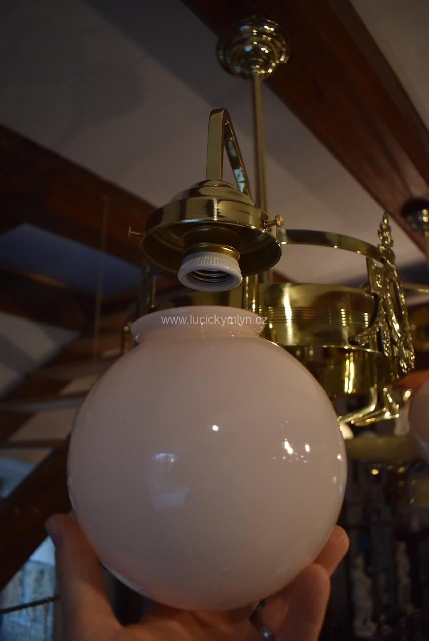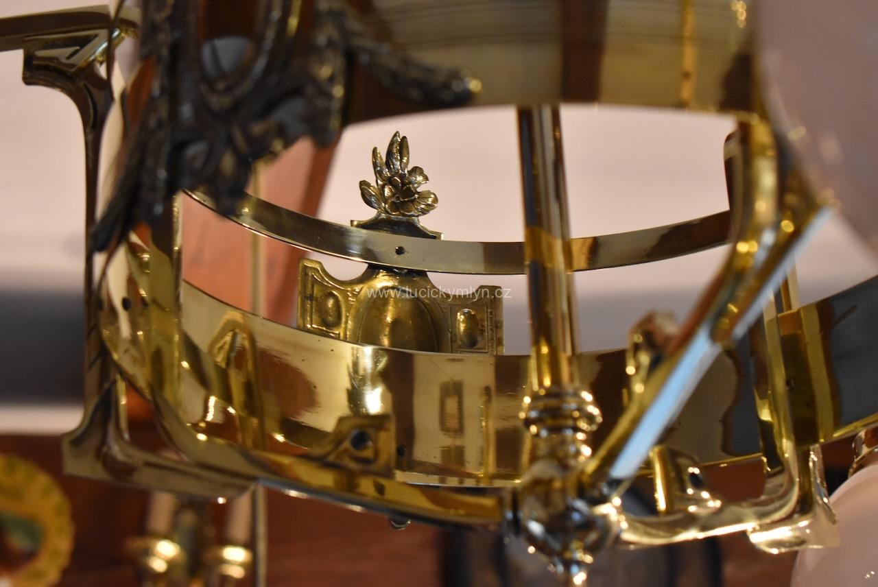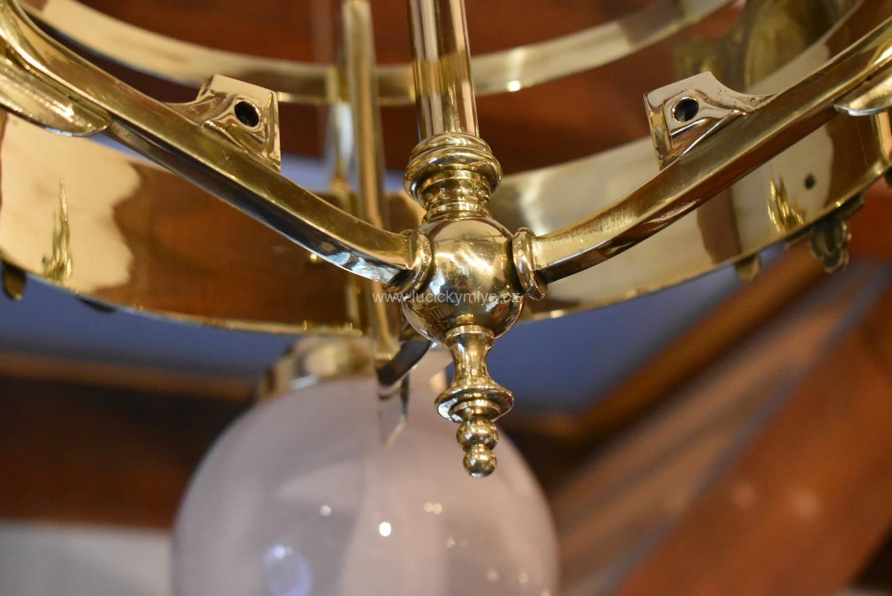 Vkusné a velice kvalitní světlo, bylo vyrobeno převážně z masivní lité a zlatě leštěné mosazi, po roce 1900. Tento zajímavý lustr, nápaditě osazený vzdušným a elegantně ztvárněným, nižším obručovým pláštěm, je působivě osazený třemi nezvykle ztvárněnými rameny, na kterých vidíme krásné, secesně stylizované, aplikace. Na širokém prstenci lustru můžeme obdivovat krásně ztvárněné secesní aplikace. Světlo má na vrcholu centrálního trubičkového závěsu nasazený, stupňovitě tlačený, mosazný krycí štítek pro el. připojení. Atypicky navržený tří-ramenný lustr má svisle zakončená hraněná ramena, osazená mosaznými upevňovacími „kloboučky” s lehce narůžovělými skleněnými koulemi. Díky nadčasové, geometricky stylizované a vkusně umírněné secesní výzdobě, můžeme toto, dnes už poměrně unikátní světlo umístit do rozličných historických prostor, nebo i ryze moderního interiéru. Salonní lustr je po celkové nákladné renovaci a s nově provedenou elektroinstalací. Mosazné objímky s porcelánovým kroužkem, mají klasický závit na běžnou žárovku.