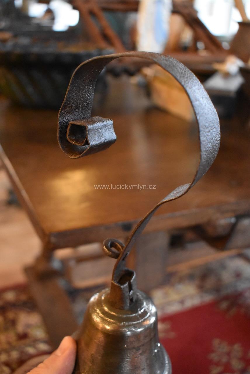 Toto jednoduché a zcela spolehlivé zařízení, obvykle používali ve starém prvorepublikovém obchodě. Bronzový zvonek se vždy hlasitě rozezněl, když do obchodu vstoupil další zákazník. Tyto poctivé a kvalitní, menší i větší zvony se vyráběly pouze ve specializovaných dílnách. Díky tomu má i tento náš zvon, krásně jasný a hluboký zvuk. Složení této zvonoviny si každý zvonař nechával pro sebe, neboť poměr obsažených kovů má zásadní vliv na odlévání i budoucí vlastnosti zvonu, včetně zvuku. Menší starožitný zvonek má silnější pevné tělo a původní závěsné srdce z kovové kuličky, zalité do silnějšího ocelového drátu. Nad upínací horní částí je ukotveno širší očko pro případné upevnění tažného provázku nebo drátu. Zvon má dlouze vinuté, ploché a delší ocelové péro, určené k rozkmitání zvonu. Stačilo otevřít nebo zavřít dveře obchodu a šikovně upevněný zvon nad nimi se okamžitě rozkmital. Na horní hraně dveří byl obvykle upevněn delší kolíček, který zasahoval (při pohybu dveří) do okraje zvonku. Tento zvonek byl upevněný ke zdi nebo dveřnímu rámu a osazený na pružném ocelovém závěsu. Zvonek lze používat i jako domovní. Návštěva může zatáhnout i na větší vzdálenost přes jednoduchou kladku a kývající se zvon Vás spolehlivě a hlasitě upozorní. Starožitný, asi stoletý, zvon se zachoval ve výborném stavu a zcela bez poškození. Nyní je po šetrném vyčištění a přeleštění. Těchto originálních, starožitných zvonů se mnoho nezachovalo. Na současném trhu jsou, až na výjimky, nabízeny pouze nové nebo zánovní a téměř bezcenné napodobeniny, které nemají dobrý zvuk a byly vyrobeny spíše pro dekoraci.